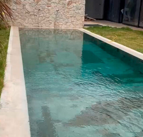 Piscina aquecida toda automatizada. Revestida com pedra Hijau, iluminada e com cascata, além de spa independente e sauna, construído por Specian Luz Piscinas